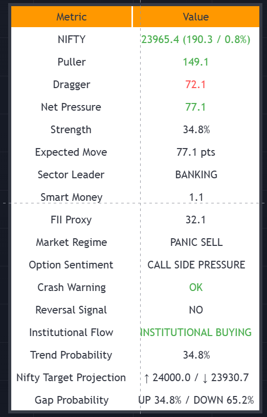 - Nifty Pressure Dashboard: Displays Strength %, Expected Move, Sector Leaders, Crash Warnings, and Reversal Signals.