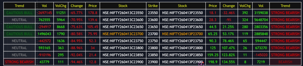 Sudden spikes in VolChg (Volume Change) often precede a breakout. If you see a massive spike at a specific strike price, it indicates institutional activity.